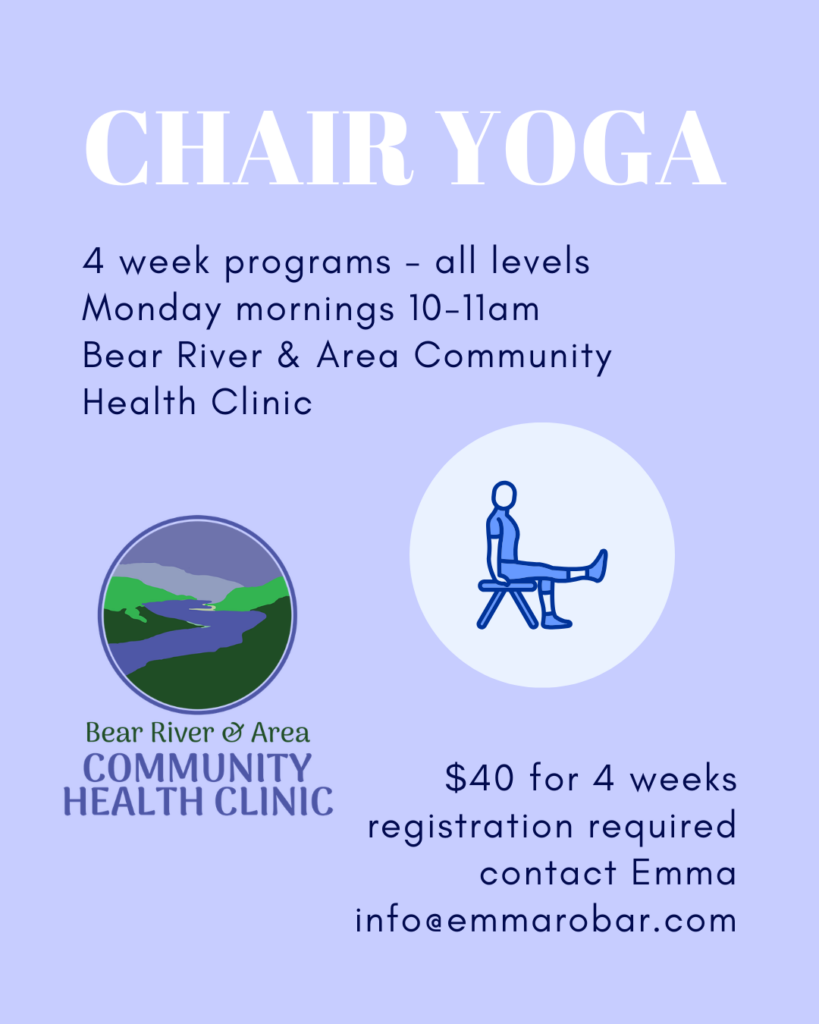 We offer 4 week Chair Yoga programs throughout the year focused on body awareness and improving functional strength. Expect gentle movement and stretching while seated and standing. Appropriate for all levels, no experience required to join. Registration is required, $40 for 4 weeks due on or before the first day of class to reserve your spot. Email Emma with questions or to register info@emmarobar.com