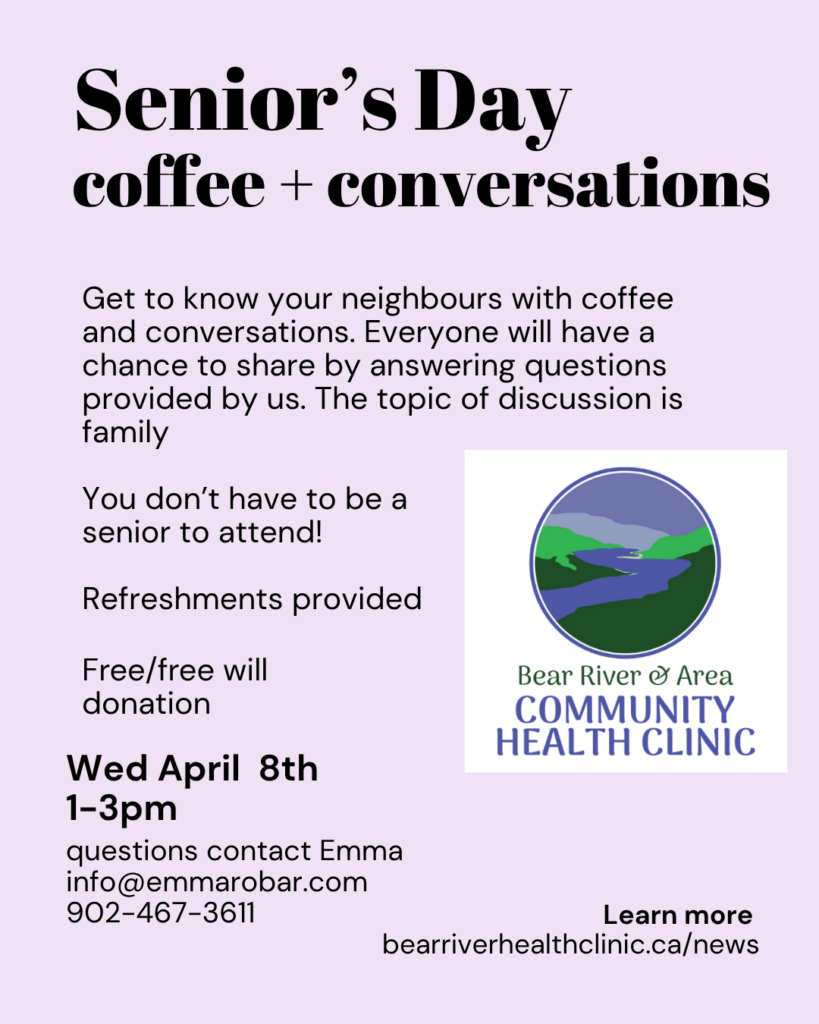Join us at the clinic for Senior’s Day on Wednesday April 8th from 1-3pm. Get to know your neighbours with coffee and conversations. Everyone will have a chance to share by answering questions provided by us. There’s no obligation to share but everyone will have the opportunity to speak on each topic. The topic of discussion is family